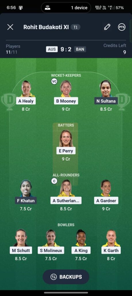 1 WK, 3 BAT, 3 AR, 4 BOWL. - Who will win AUS W vs BAN W match?