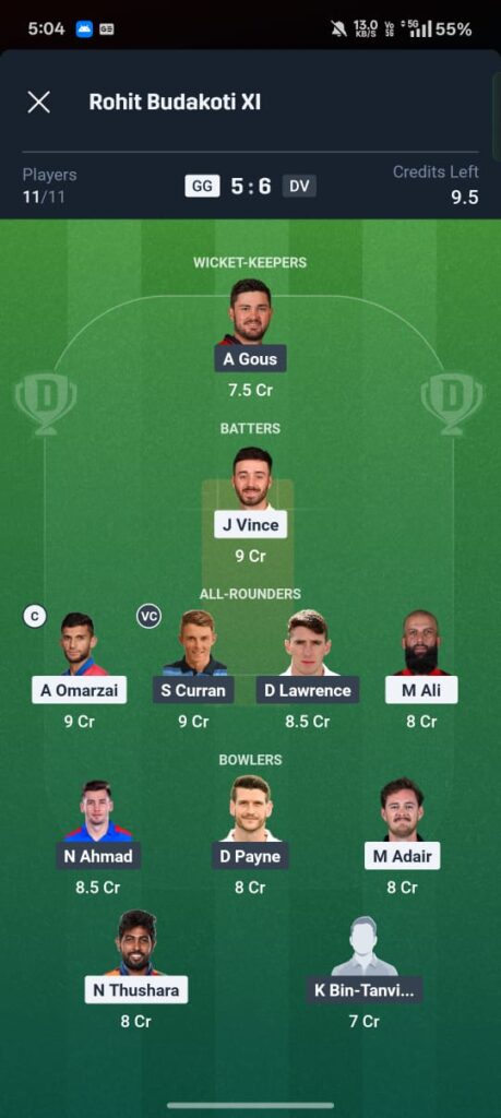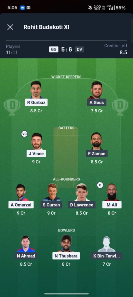 | Safe Choices | Azmatullah Omarzai (GG), Sam Curran (DV) | James Vince (GG), Rahmanullah Gurbaz (GG) |