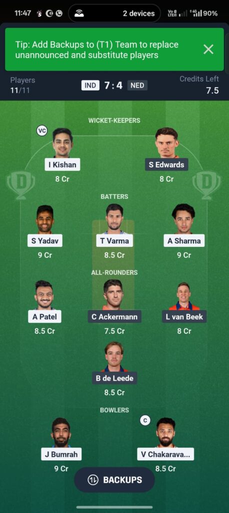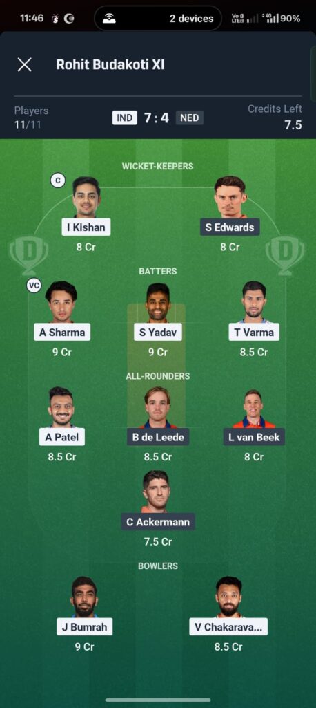 In Small Leagues, consistency beats variance. Go heavy on India’s confirmed performers — Ishan Kishan’s powerplay impact and Varun Chakravarthy’s mystery-spin economy rate make them non-negotiables. Pick one NED differential (Bas de Leede) for extra points if he fires.