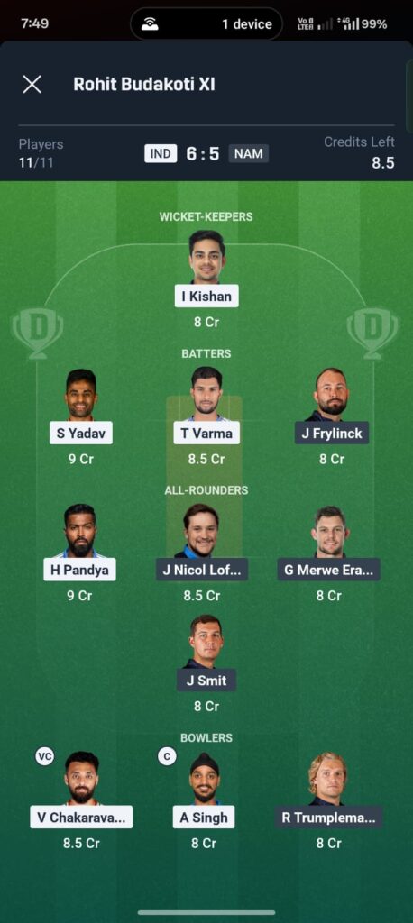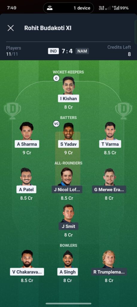 - High-Ceiling Pick: Shivam Dube (If India bats first, his power-hitting against Namibia’s medium pacers could yield 50+ points in minutes).