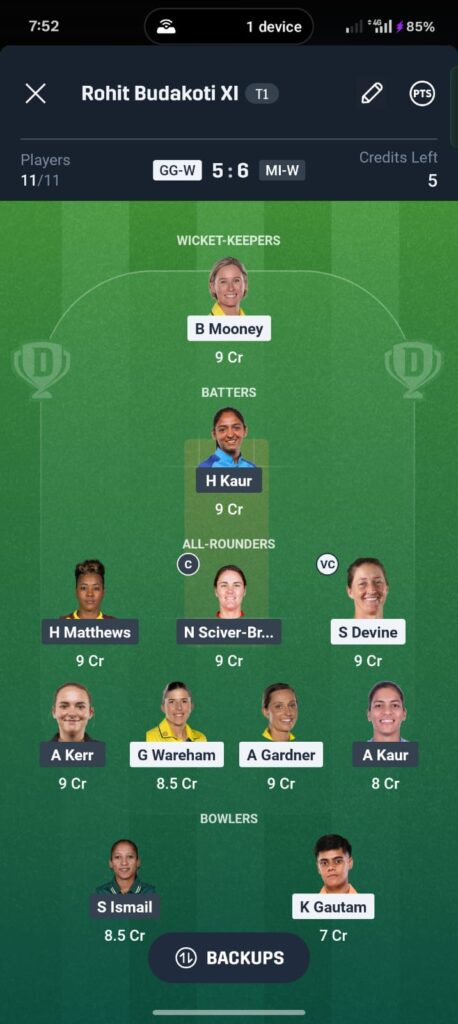 For small leagues, Harmanpreet Kaur makes the safest captain choice with Beth Mooney or Nat Sciver-Brunt as vice-captain. Grand league players seeking differentiation can consider Sophie Devine or Ashleigh Gardner as captain with lower ownership percentages.
