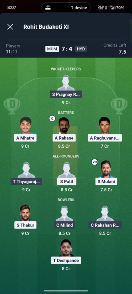 This Super League clash between Mumbai and Hyderabad is expected to be a tactical battle. Mumbai looks stronger on paper with a deep batting lineup and experienced internationals like Rahane and Thakur. However, Hyderabad’s disciplined bowling unit could spring a surprise. For your fantasy team, backing Mumbai’s top order and all-rounders seems the safest route to victory.