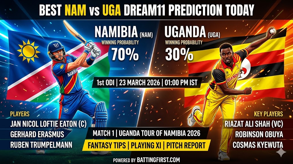 Get the best NAM vs UGA Dream11 prediction for Match 1, Uganda tour of Namibia. Expert fantasy tips, pitch report, playing XI, and top captain picks. Win big today!
