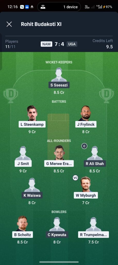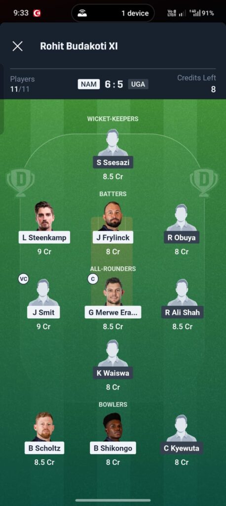 Why this team works: This combination maximizes the “All-rounder” heavy nature of Namibia. Erasmus and Loftie Eaton are the safest C/VC choices as they are guaranteed to bowl their quota and bat in the top 5.