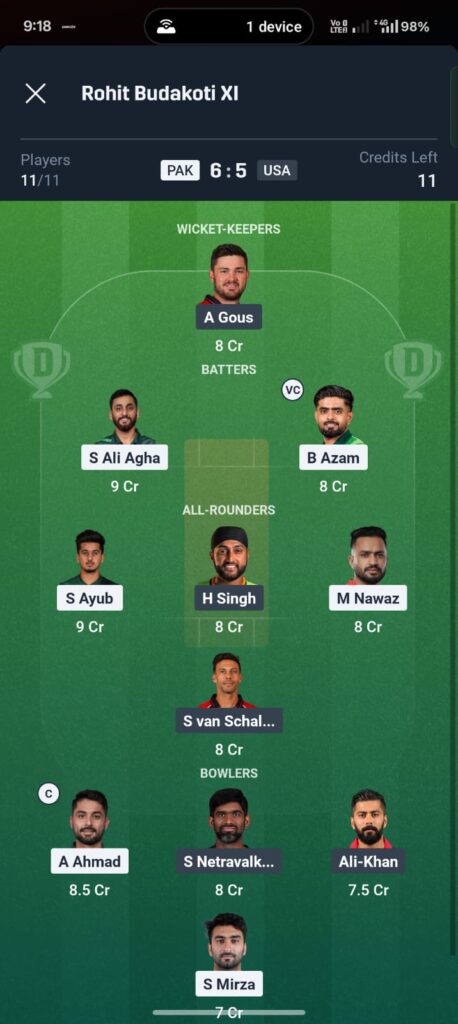 5. आज की बेस्ट Dream11 टीम (Small League Recommendation) PAK vs USA Dream11 Prediction Today match