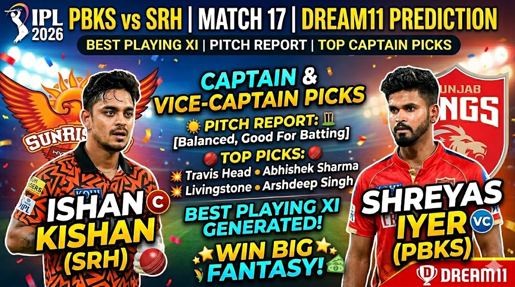 PBKS vs SRH Dream11 Prediction IPL 2026 Match 17 Today โ Best Playing XI, Pitch Report & Top Captain Picks. Win big fantasy
