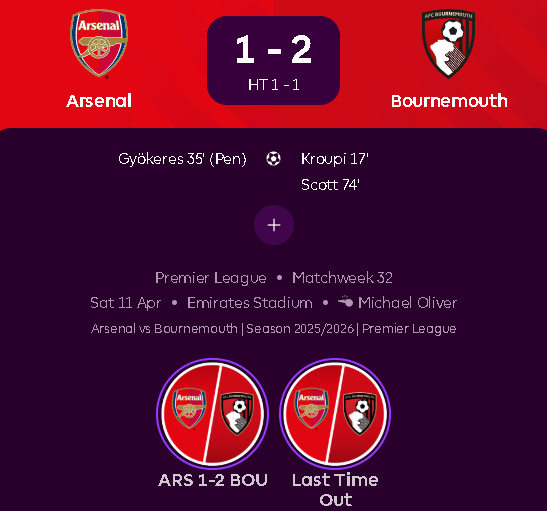 The first half of the Premier League Fixtures Game week 32 Season 25-26 took place yesterday, Saturday, April 11th, and it will be remembered as the day the title race took a massive detour.