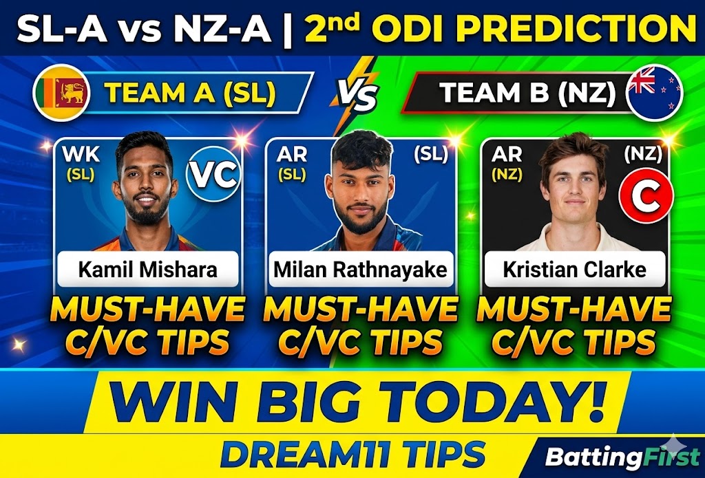 Get the best SL-A vs NZ-A Dream11 prediction for Match 2, NZ-A tour of SL. Expert fantasy tips, pitch report, playing XI, and top captain picks. Win big today!