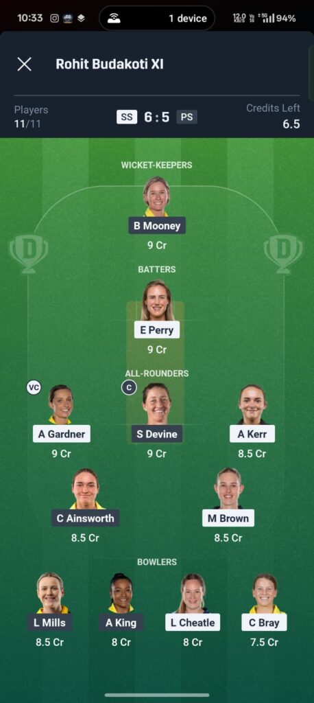 Strategy: Beth Mooney (C) is the most consistent batter, making her a safe captain. Ellyse Perry (VC) is in red-hot form and is a reliable vice-captain choice.