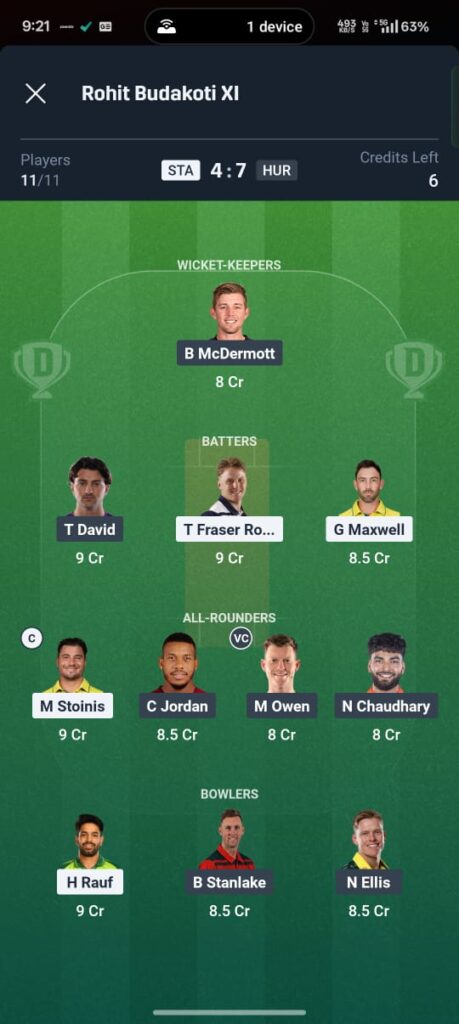 The battle between Haris Rauf’s pace and Tim David’s finishing will be a key highlight. Additionally, the MCG’s massive dimensions mean players like Glenn Maxwell and Marcus Stoinis, who rely on finding gaps as much as power hitting, will be vital. For the Hurricanes, the form of Mitchell Owen and Nikhil Chaudhary at the top is a massive boost.