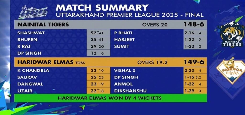 The Uttarakhand Premier League (UPL) 2025 Final witnessed a pulsating clash between Haridwar Elmas and Nainital Tigers at the Rajiv Gandhi International Cricket Stadium, Dehradun.