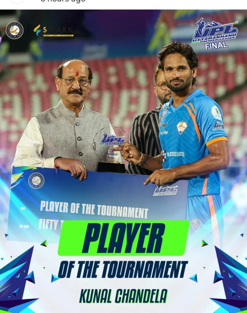 Kunal not only accumulated runs but played match-winning knocks when it mattered most. His fifty in the semi-final and crucial 40-plus score in the final helped Haridwar Elmas lift the championship trophy. Whether facing spinners or fast bowlers, Chandela’s calm presence gave confidence to his entire team.