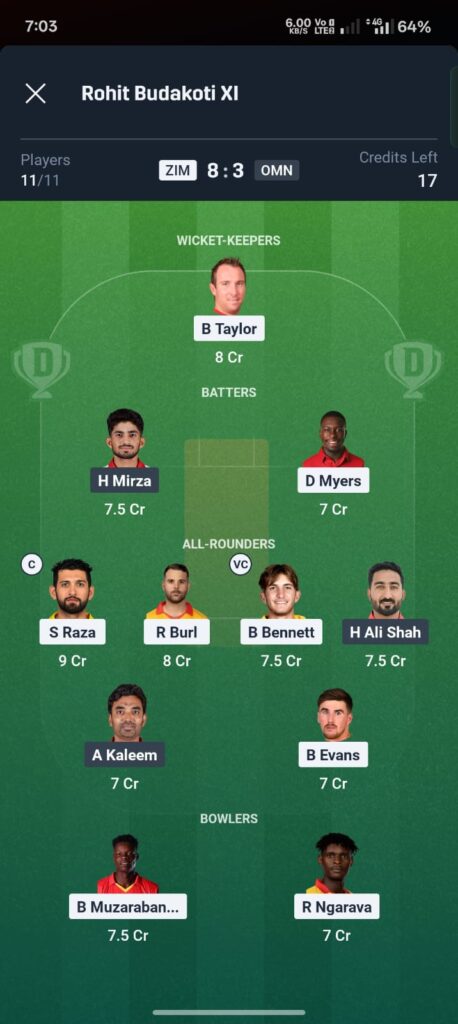 Brian Bennett (ZIM): The 22-year-old has emerged as Zimbabwe’s powerplay enforcer, striking at 152+ in recent games. His 56*(28) in the warm-up showcased fearless batting—expect him to target Oman’s new-ball bowlers aggressively. Strong pick for boundaries (4s/6s points).